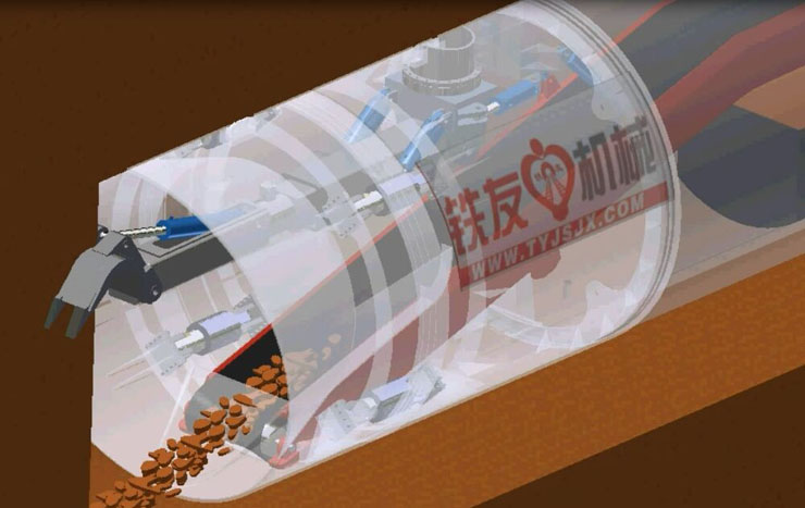挖掘式頂管機是一種非開挖施工工藝,當(dāng)頂管機前端的斜面(上凸下縮,有效控制和預(yù)防泥土塌落)進入土層中,頂管內(nèi)部的挖掘斗通過液壓機械臂(挖斗油缸和變幅油缸的行程)的變化,將頂管機上部泥土挖掘下來,挖掘下的泥土匯集在機頭下部皮帶輸送機位置,啟動皮帶輸送機,輸送帶將泥土輸送到電動小車(可調(diào)速)上,小車將泥土從工作井送出指定地點,在機頭后頂入水泥管,這樣在工作井和接受井間鋪設(shè)一條水泥管道。